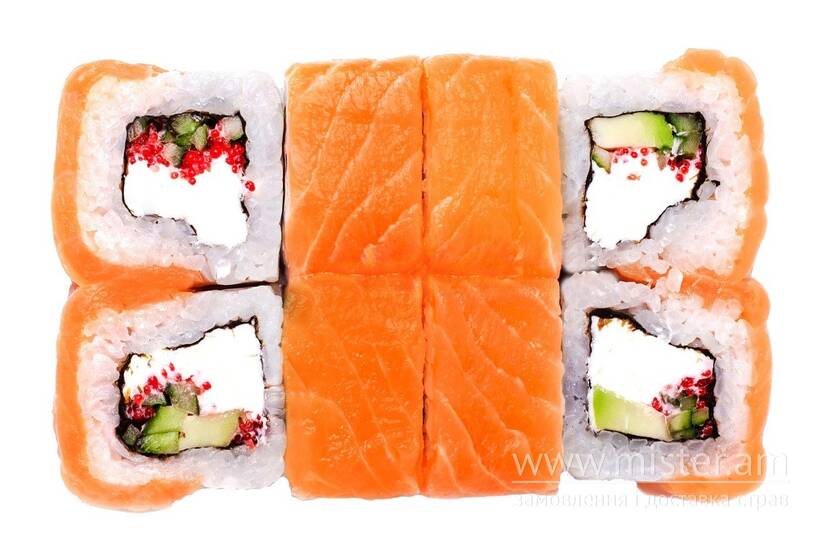 Авокадо, крем-сир, лосось, норі, огірок, рис, тобіко червона, васабі, імбир, соєвий соус.