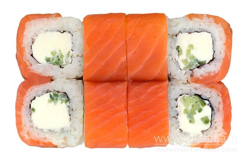 Крем-сир, лосось копчений, норі, огірок, рис, васабі, імбир, соєвий соус.