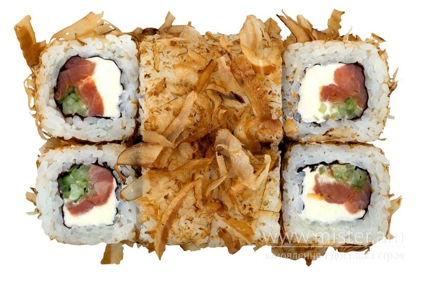 Крем-сир, лосось копчений, норі, огірок, рис, стружка тунця, васабі, імбир, соєвий соус.