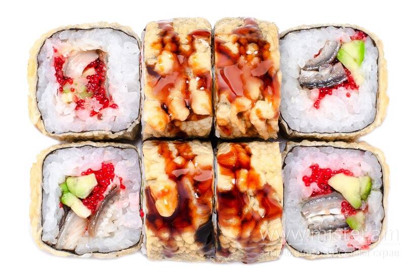 Авокадо, вугор, норі, рис, соус унагі, сухарі панко, темпура, тобіко червона, васабі, імбир, соєвий соус.