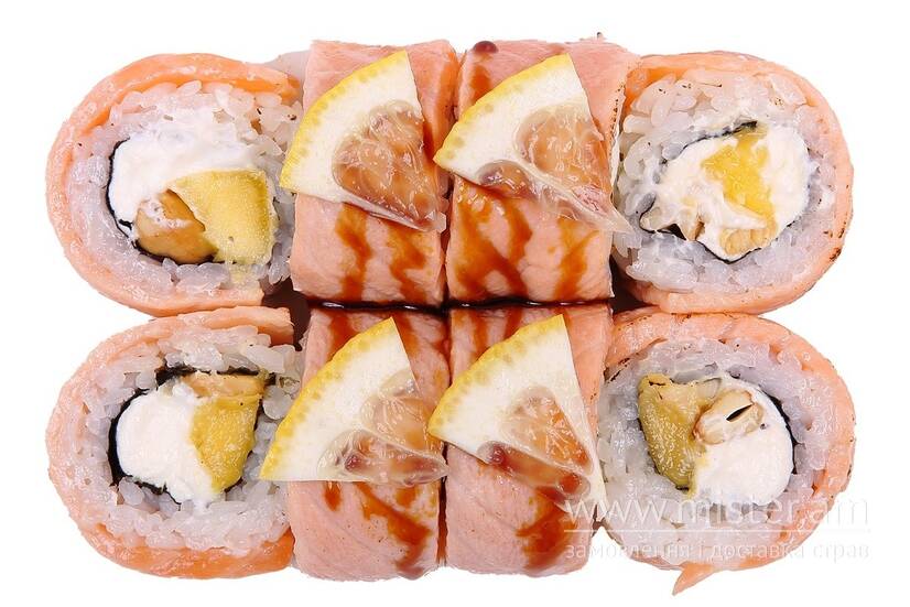 Горіх кеш'ю, крем-сир, лимон, лосось, манго, норі, рис, соус унагі, васабі, імбир, соєвий соус.
