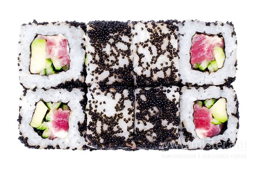 Авокадо, норі, огірок, рис, тобіко чорна, тунець, японський майонез, васабі, імбир, соєвий соус.