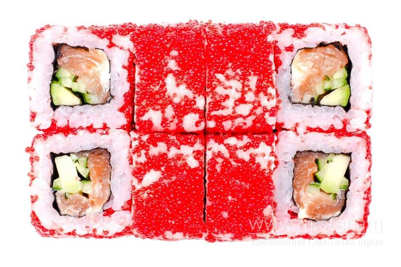 Авокадо, лосось, майонез японський, норі, огірок, рис, тобіко червона, васабі, імбир, соєвий соус.