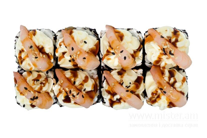 Креветка, крем-сир, кунжут мікс, лосось копчений, норі, рис, соус унагі, тобіко чорна, васабі, імбир, соєвий соус.