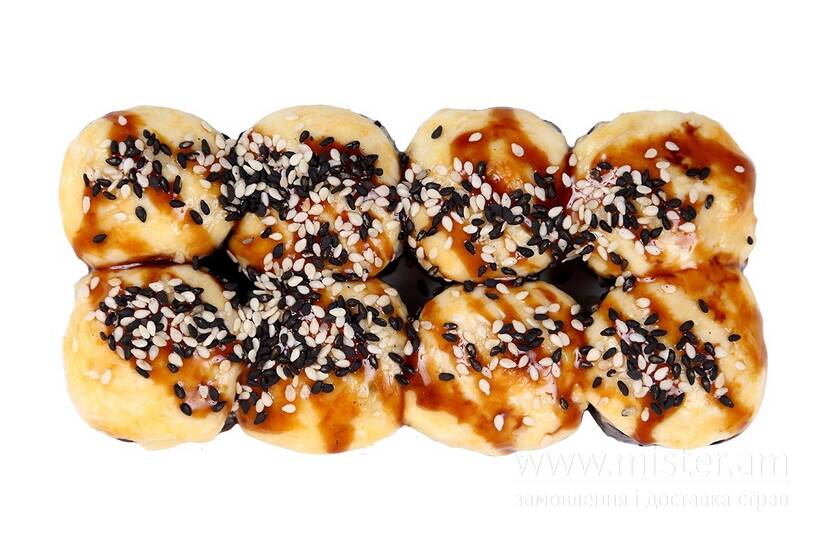 Айсберг, гауда, крем-сир, кунжут мікс, норі, соус унагі, японський майонез, васабі, імбир, соєвий соус.