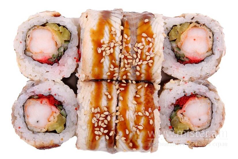 Вугор, дайкон, кунжут білий, масаго, норі, огірок, рис, соус унагі, тигрова креветка, васабі, імбир, соєвий соус.