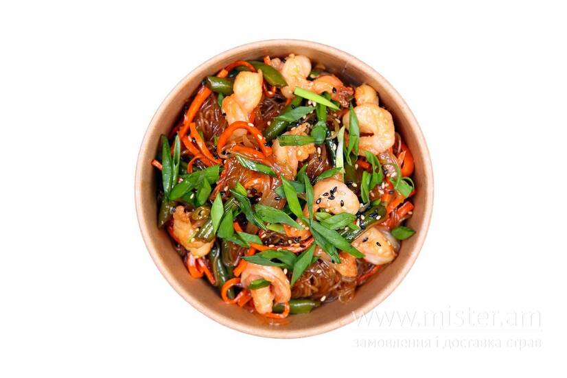Зелена цибуля, креветка Тигрова, кунжут, морква, соус Теріяки, спаржа, устричний соус, фунчоза, цибуля.