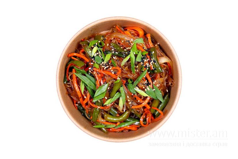 Зелена цибуля, кунжут, морква, соус Теріяки, спаржа, устричний соус, фунчоза, цибуля.