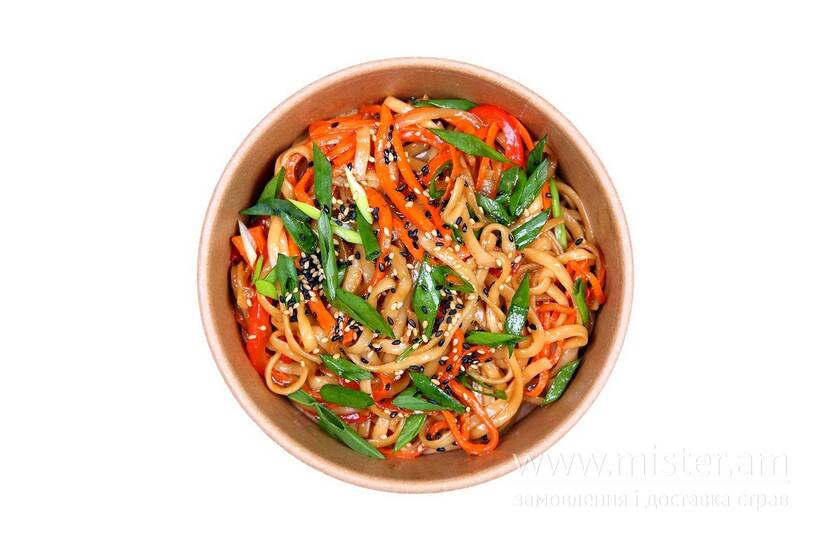 Болгарський перець, зелена цибуля, кунжут, морква, удон, устричний соус, цибуля, часниковий соус.