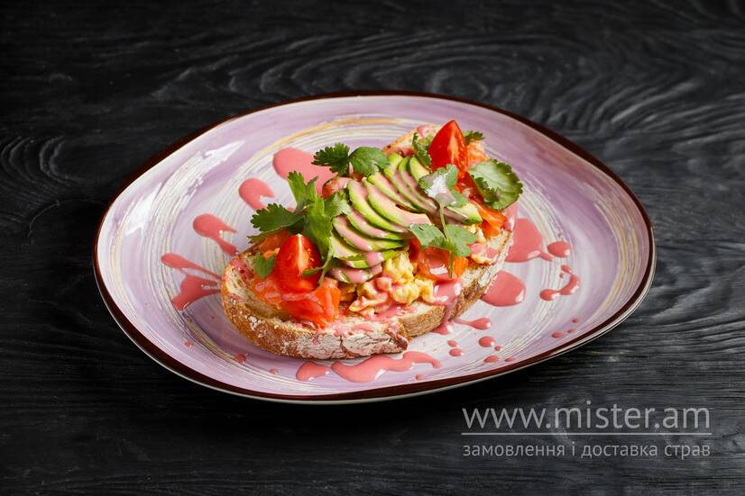 Грильована скибка крафтового хліба зі слабосоленим лососем, авокадо на теплому скремблі, полита буряковим соусом.