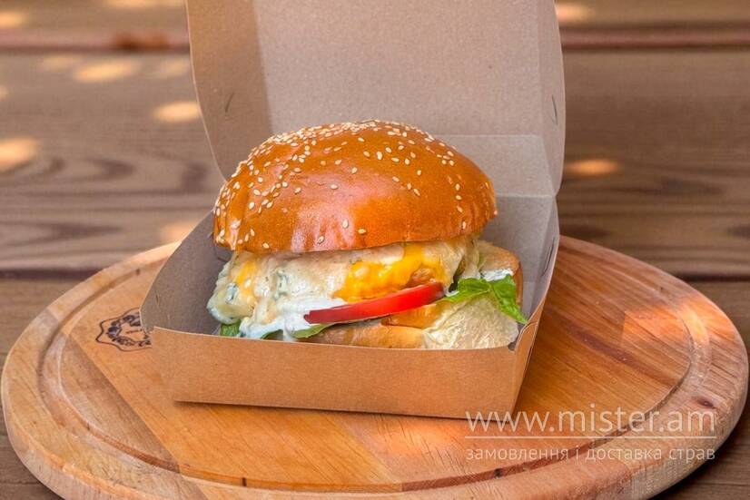 Булка з курячою котлетою, сиром чедер та горгонзола, томатами, салатом та вершковим соусом.
