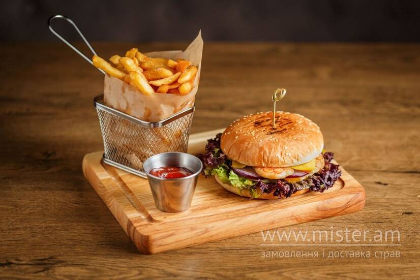 Пампушка бургер з хвостатими тигровими креветками, фрі