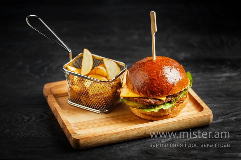 Пампушка з яловичою котлетою,соленим огірком та соусом BBQ, фрі