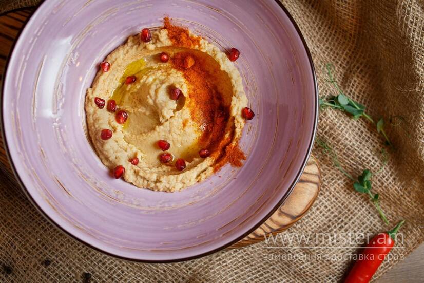 Закуска з нутового пюре з грильованим перцем та кунжутом.