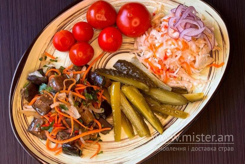Томати солоні, огірок квашений, капуста квашена, баклажани мариновані з гостринкою.