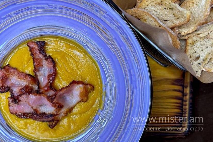 Крем-суп сочевиці зі смаженим беконом та пармезаном