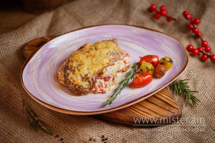 Шмат свинини запечений з картоплею та томатами під сиром моцарела