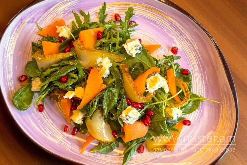 Гарбуза та груша запечені, мікс салатів, сир дорблю,гранат, фірмовий соус