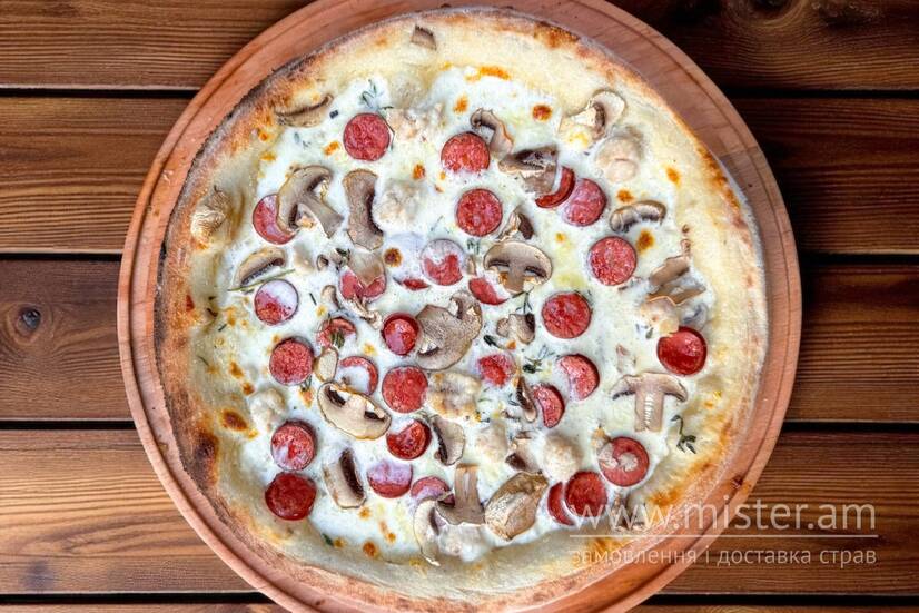 Ковбаски, печериці, моцарела, чебрець, соус вершковий, основа.