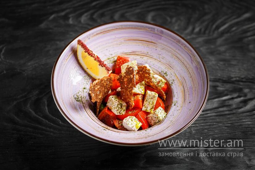 Томати, огірок, солодкий перець, бринза, хрумкі крутони, соус Вінегрет.