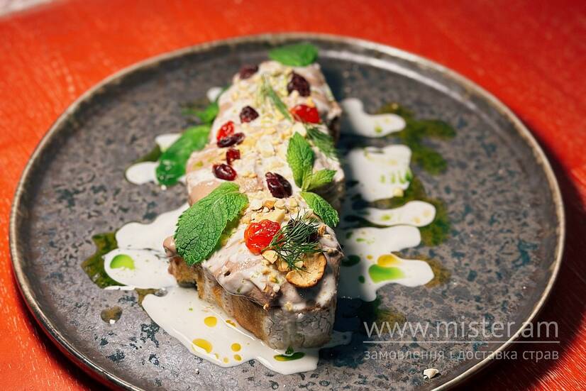 Домашній паштет з курячоі печінки з сухофруктами, 2 видами соусу, горіхами кеш'ю та пряною зеленню. Подаємо на хлібі.