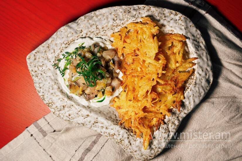 Хрумкі картопляні деруни з тар-таром з копченої риби та кремом з густої сметани.