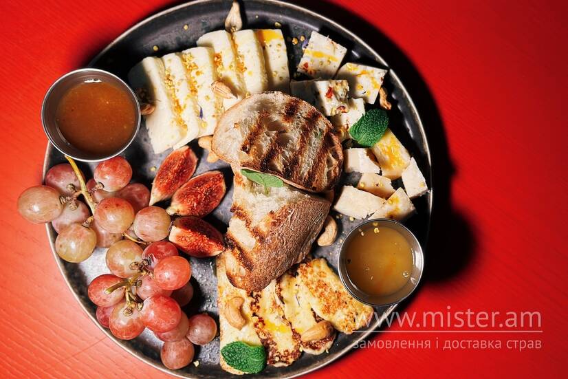 Смажений халумі, бринза з овочами, пармезан та сирні коники з сулугуні. Подаємо з хлібом, соусами, горіхами, виноградом та грушею.