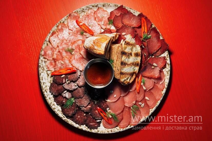 Бастурма, махан, свиняча шийка, мацик, в'ялена свинина. Подаємо з хлібом, чилі та насінням.