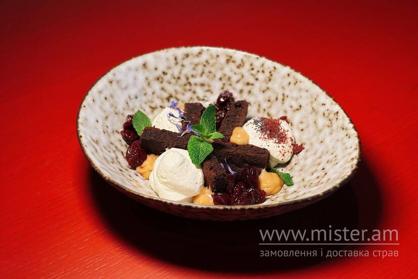 Шоколадний брауні з маком, кремом Шанті, солоною карамеллю та вишнею, томленою в бурбоні.