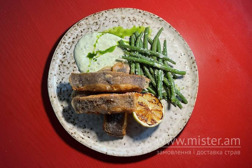 Карп, в соусі понзу з томатами та печерицями. Подаємо з каперсами. Річкова риба, яка може містити міні-кісточки.