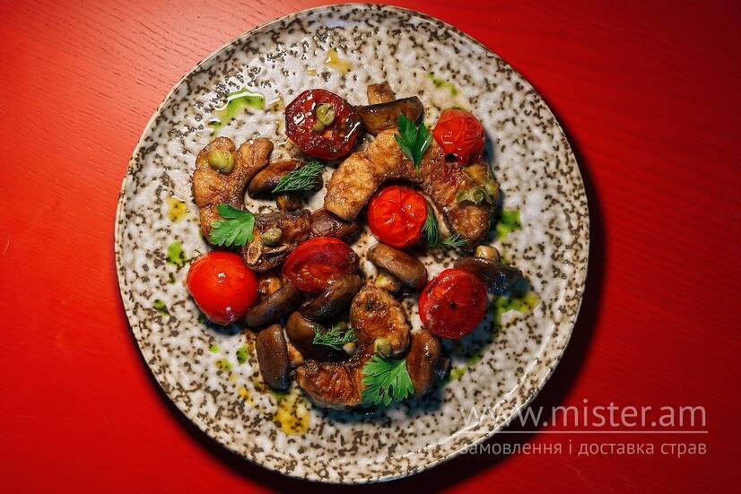 Карп, в соусі понзу з томатами та печерицями. Подаємо з каперсами. Річкова риба, яка може містити міні-кісточки.