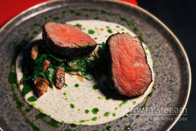 Ніжна яловича вирізка з білими грибами, шпинатом, кремом зі смаженої картоплі. Рекомендована просмажка медіум ре-медіум.