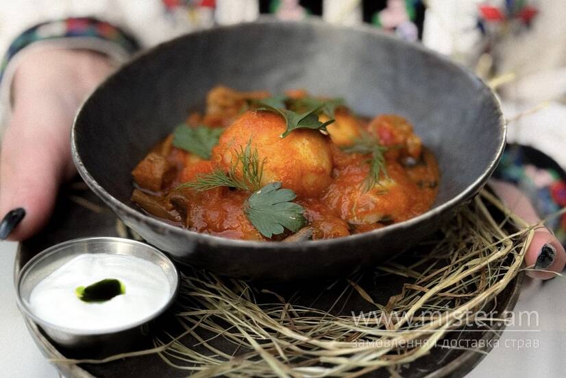 Насичений гуляш по-гуцульски з томленим ошийком, грибами та томатами з копченою сметаною та зеленню.