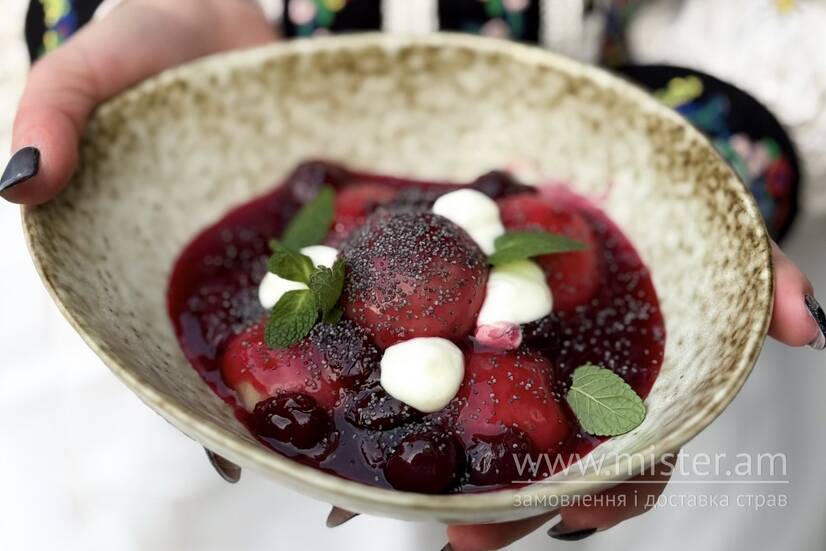 Парові галушки у вишневому киселі зі сметанковим кремом та маком.