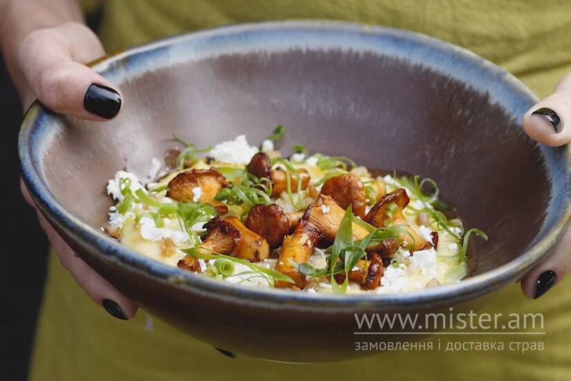 Томлена в горщику, свиняча вирізка з лісовими грибами та цибулею у вершково-сметанному соусі.