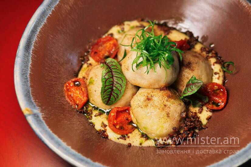 Парові галушки з курячим жульєном та печеними томатами