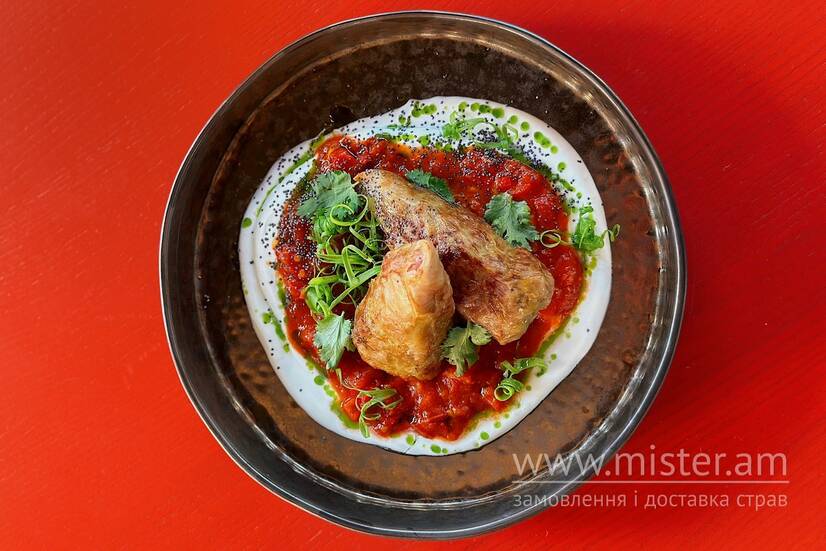 Голубці з дичини з булгуром. Подаємо з копченою сметаною, соус з томатів та перців, посипаємо маком та кінзою.