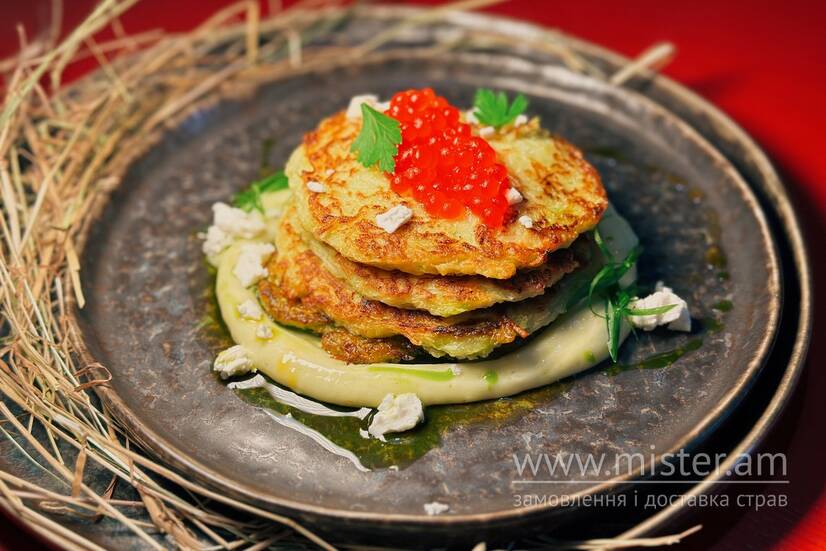 Фірмові кабачкові оладки з соусом на основі домашнього майонезу та печеного часнику. Подаємо з червоною ікрою та бринзою.