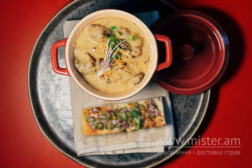 Тушковані сердечки, шлуночки та печінка куряча у вершковому соусі з грибами. Подаємо з домашнім хлібом та релішем з маринованих огірків.