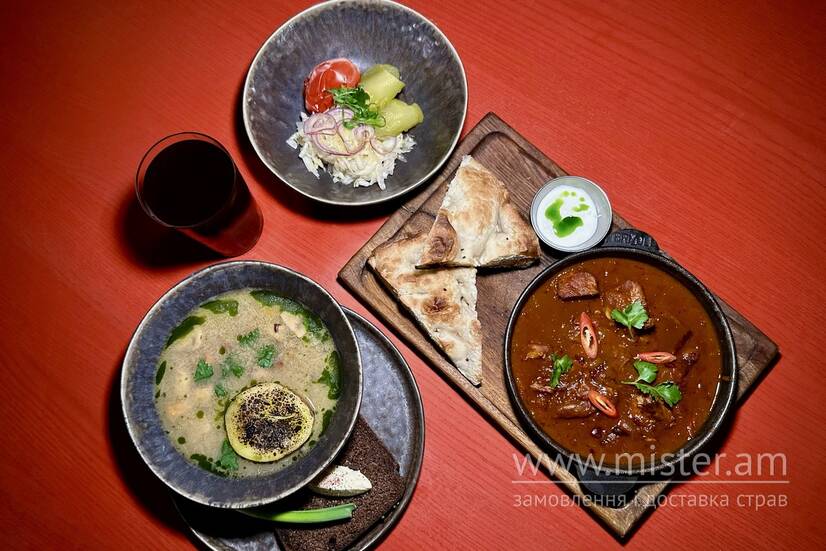 - Гуцульський гуляш зі свинини та грибів у томатному соусі з хрумким лавашем;