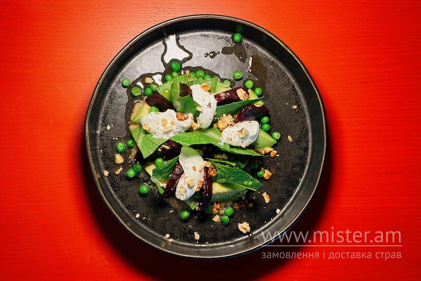 Неочікуване поєднання буряку та авокадо, крем з фети та вершків, зелений горошок та горіховий соус.