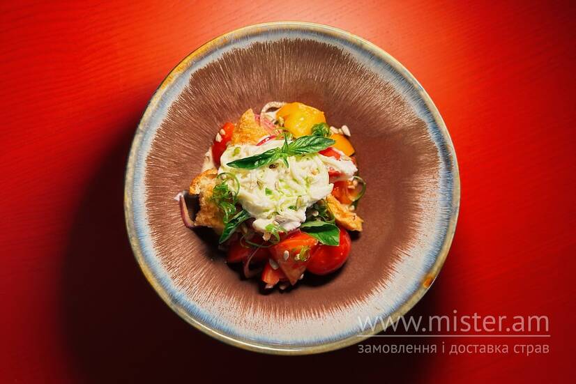 Куркулі Салат з кольорових томатів та вершковим сулугуні