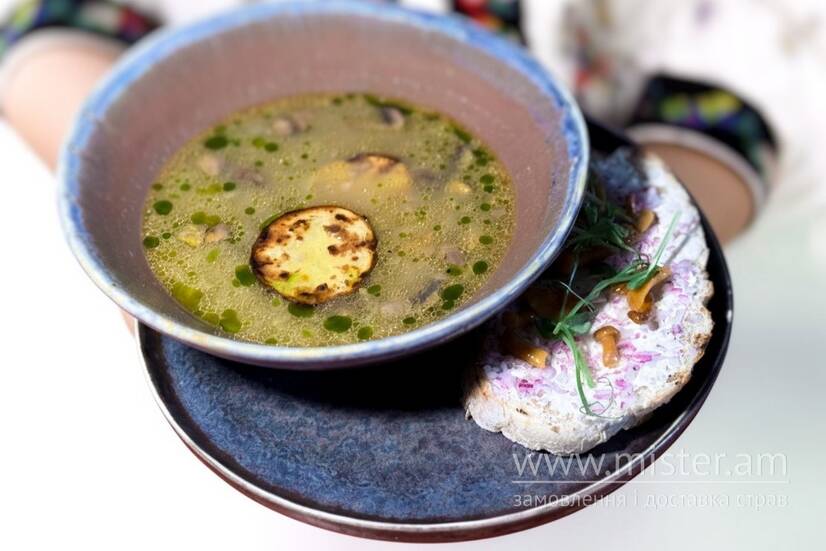 Фірмова юшка за старовинним рецептом з ліслвих грибів. Подаємо з печеною картоплею та накладанцем з маринованими опеньками та цибулею.