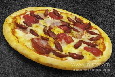 Основа, соус "Пілаті", моцарела, ковбаски мисливські, салямі, бекон.
