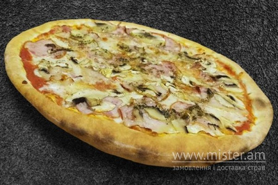 Основа, соус "Пілаті", моцарела, бекон, шинка, печериці, часникова олія.
