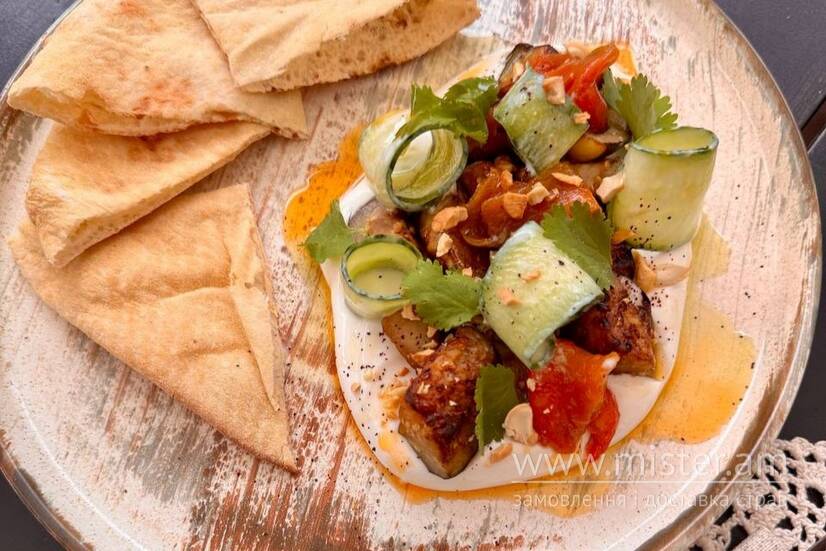 Це свято свіжості, що поєднує теплий, димний аромат запечених овочів із живою хрусткістю свіжого огірка та кінзи. Ніжності додає соус з крем-фети та завершує страву справжня італійська фокача.