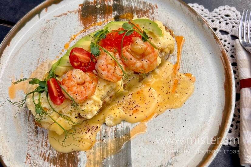Фреш тост зі скрамблом тигровою креветкою та авокадо