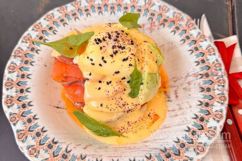 Ніжні панкейки солоним лососем пряного посолу, яйцем пашот, стиглим авокадо, витриманим сиром пармезан та ніжним соусом голландез.