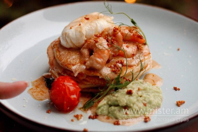 Ніжні панкейки з тигровою креветкою, яйцем пашот, пармезаном та гуакамоле з соусом світ-чилі.