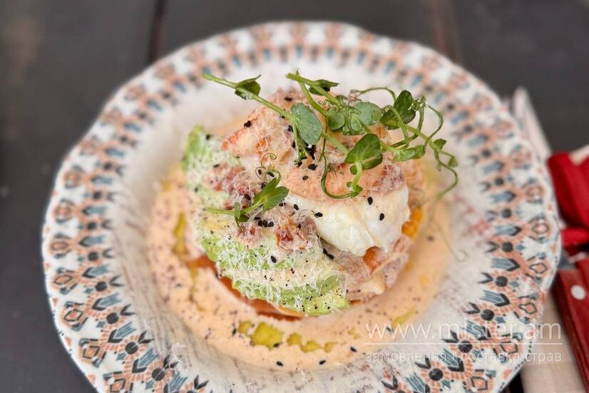 Панкейки з тигровою креветкою та піканте гуакамоле